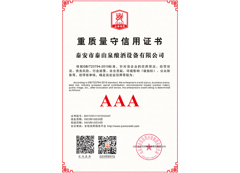 泰安市泰山泉釀酒設(shè)備有限公司,是一家專業(yè)從事釀酒設(shè)備機(jī)械化研發(fā)并集技術(shù)咨詢,工程設(shè)計(jì),制造安裝,人員培訓(xùn)及售后服務(wù)為一體的綜合性企業(yè),本公司主要產(chǎn)品為:大曲清香、小曲清香、大曲醬香、大曲濃香等香型白酒機(jī)械化設(shè)備。 本公司與中國科學(xué)院自動化研究所簽訂技術(shù)服務(wù)合同,引進(jìn)先進(jìn)技術(shù),研究生產(chǎn)全自動化機(jī)械釀酒設(shè)備,由中國科學(xué)自動化研究所的技術(shù)支持,打造最先進(jìn)的生產(chǎn)釀酒設(shè)備,公司有信心打造全國最先進(jìn)白酒...